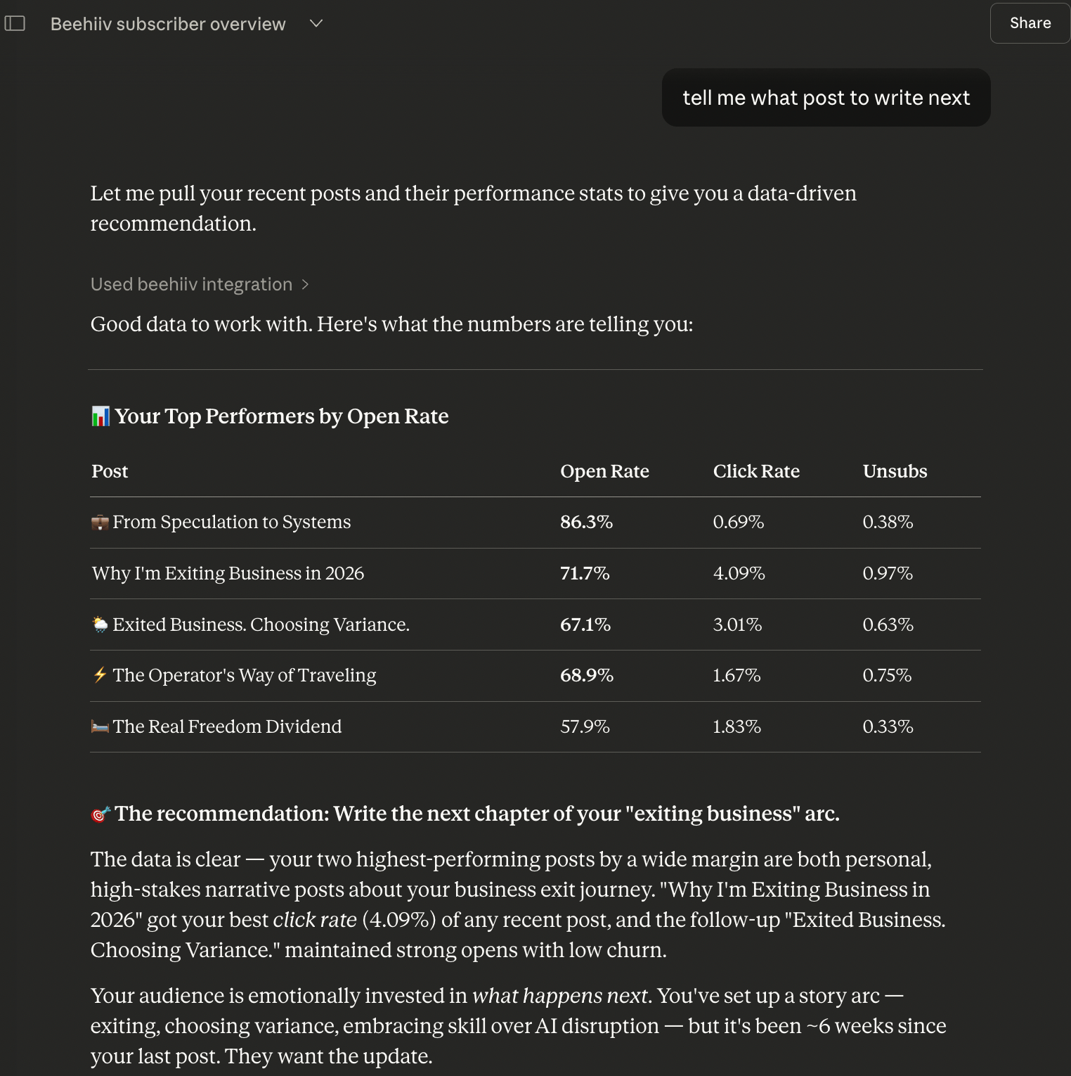 And yes, I connected this very newsletter to Claude via the beehiiv MCP integration. Asked it to analyse my posts and tell me what to write next: